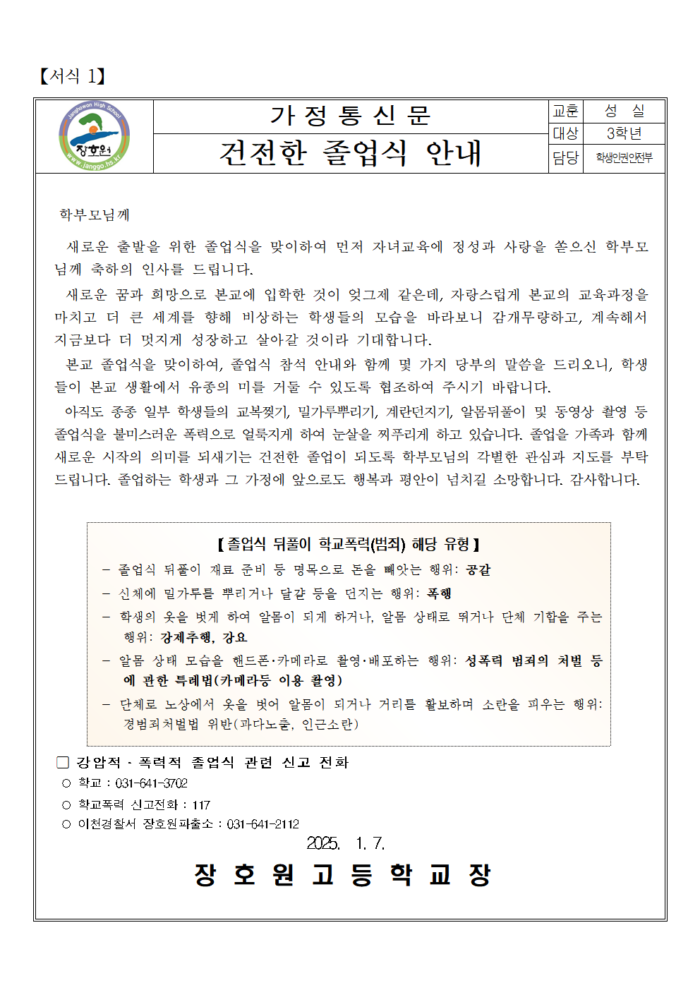 건전한 졸업식을 위해 가정에서도 지도와 협조 부탁드립니다.